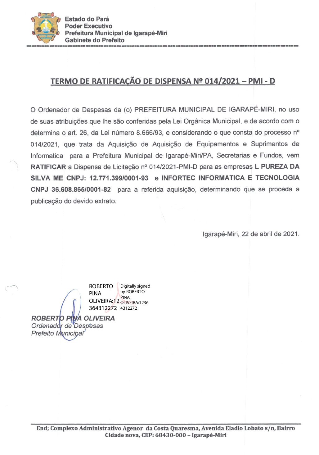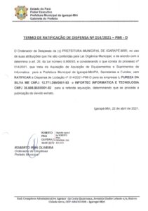 TERMO DE RATIFICACAO REFERENTE A DISPENSA Nº 014 AQUISIÇÃO DE EQUIPAMENTO E SUPRIMENTO DE INFORMÁTICA
